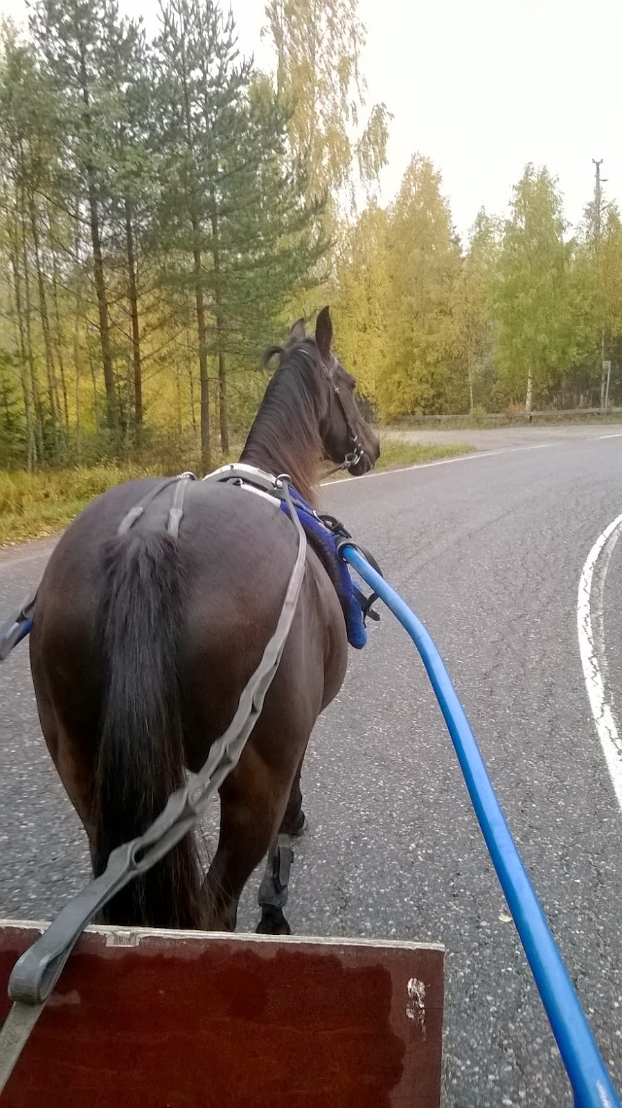 Vi fodrade hästarna med lunchhö och tog Barbie ut på en tur med kärran. Vi fick för oss att köra in till Grundsjö-byn, och det gjorde vi. Barbie var pigg och lite småfundersam över varför vi gick åt helt fel håll och varför hon måste skritta på asfalt. Då vi kommit genom byn fortsatte vi en bit in på sandvägen mot Västankvarn så att hon fick springa av sig lite. Då vi vände tillbaka och skulle över 51'an tillbaka för att komma hem fick Barbie spunk då jag hoppade ur kärran och ledde henne över vägen. Då jag skulle upp i kärran tillbaka hann jag precis få ett ben i kärran då hon fräste iväg i full trav, så det var bara att hålla i sig för brinnkära livet med ett ben halvt i hjulet och skratt-tårar sprutande. Detta är livet!